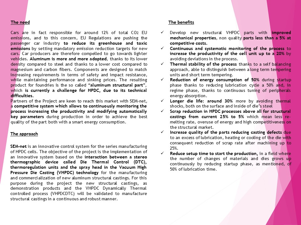 SEM-net is an innovative control system for the series manufacturing of HPDC cells. The objective of the project is the implementation of an innovative system based on the interaction between a stereo thermographic device called Die Thermal Control (DTC), thermoregulation units and the spray head in the Vacuum High Pressure Die Casting (VHPDC) technology for the manufacturing and commercialization of new aluminum structural castings. For this purpose during the project the new structural castings, as demonstration products and the VHPDC Dynamically Thermal controlled process (VHPDCDTC) will be validated to manufacture structural castings in a continuous and robust manner.